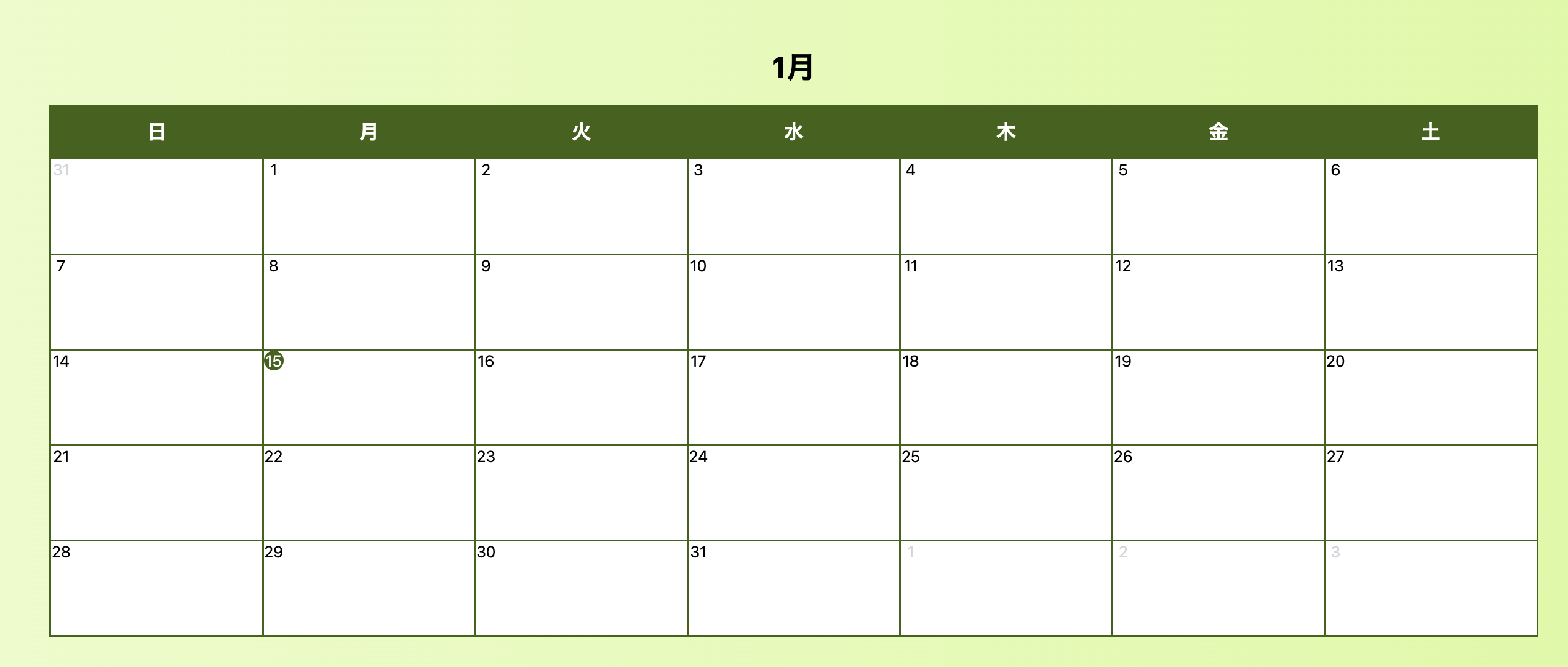 上記にて、以下のように12/31と2/1,2,3が灰色の文字色となり、今日の日付はlimeの背景色がついたかと思います。