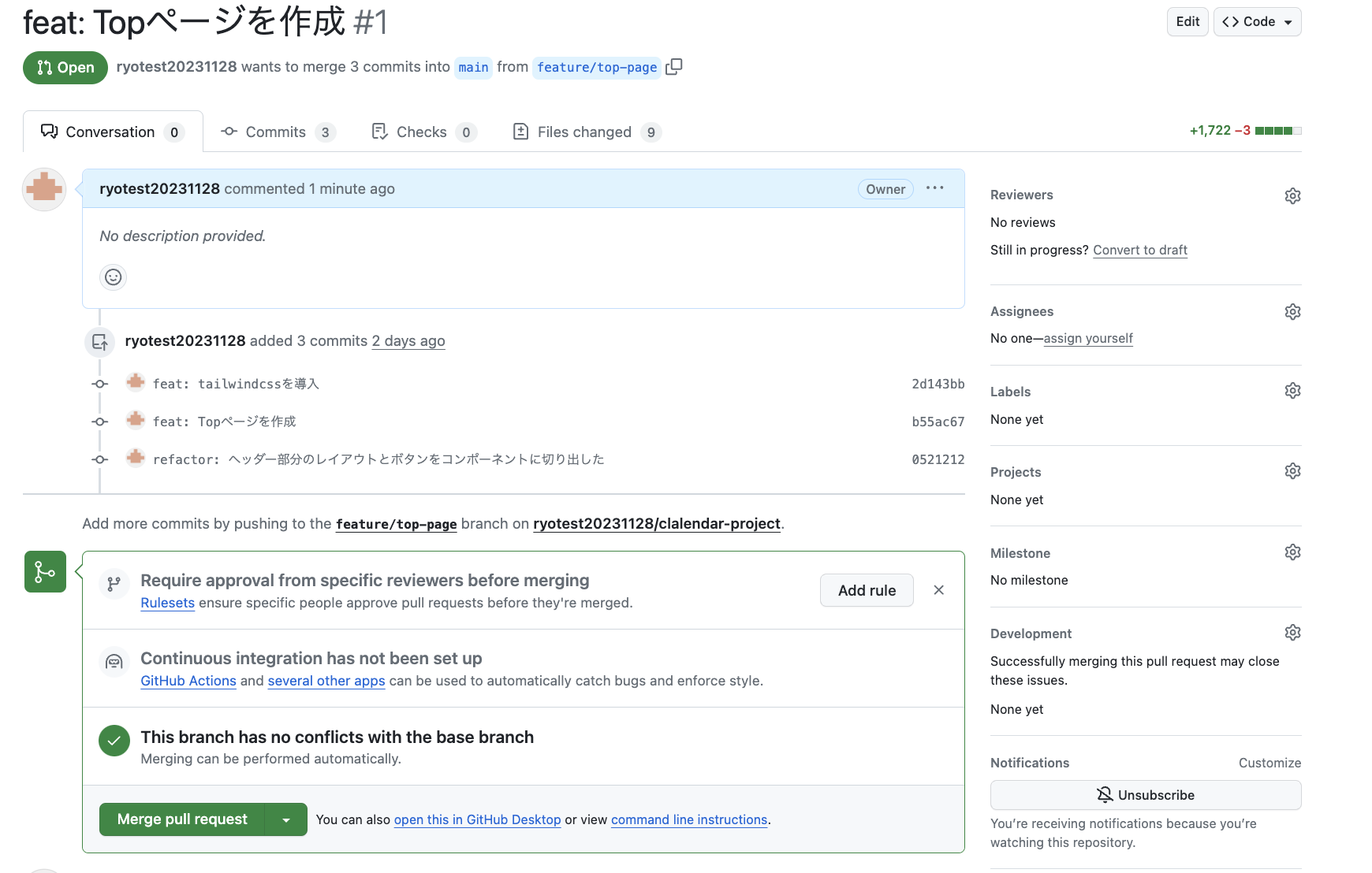 これでGitHubのリポジトリのページにいき、main <- feature/top-pageのPRを作成しましょう。