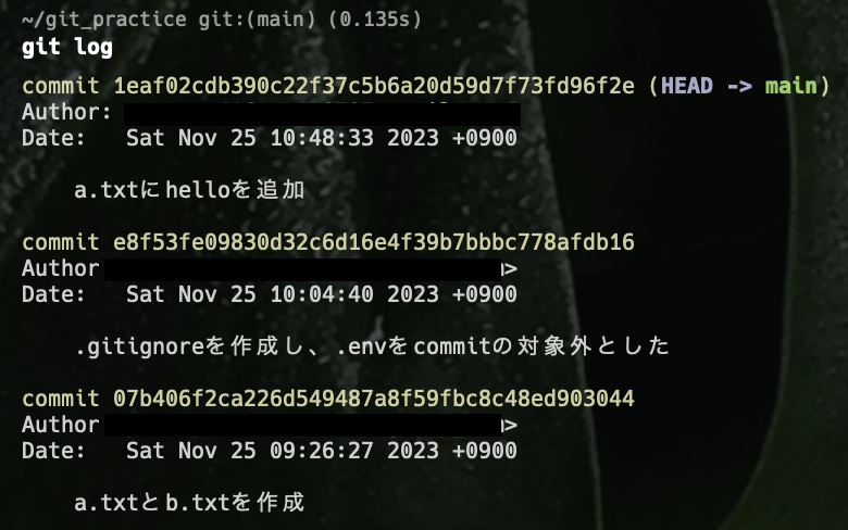 過去のcommitを確認する場合は、`git log`コマンドを叩きます。
