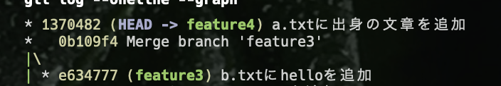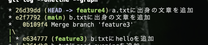 再度git logにて確認すると、`feature1`でのcommitの前にmainでのcommitが追加されたかと思います。