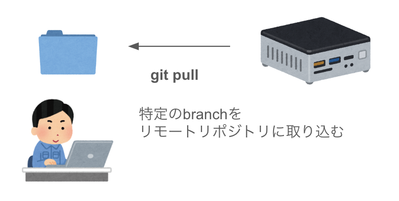 リモートリポジトリにて大元のbranchが更新された際に、それをローカルリポジトリに取り込むために、**pull(リモートリポジトリの特定のbranchをローカルリポジトリに取り込む)**&#x3057;ます。