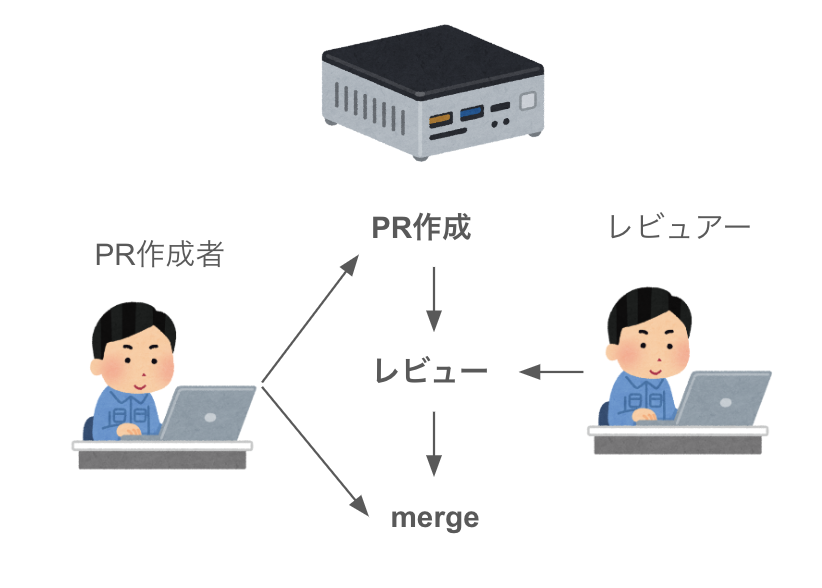 この**PR**を別の人が**レビュー(PRをチェックすること)**&#x3092;して、問題なければ大元のbranchに**merge**を行います。