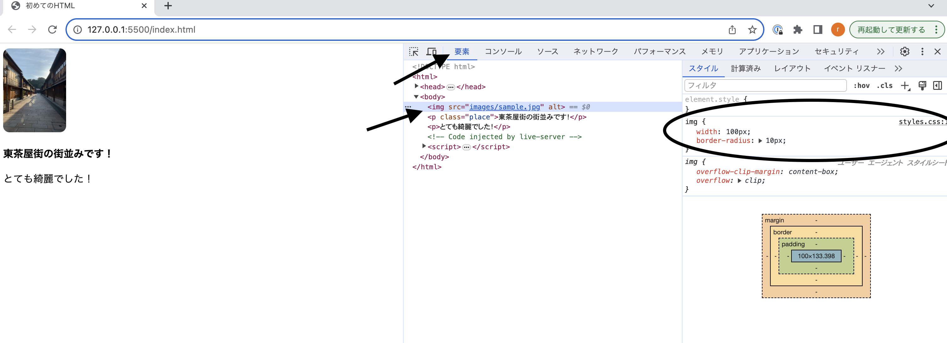 <!DOCTYPE html><html><head><title>初めてのHTML</title></head><body><img src="images/sample.jpg" alt="東茶屋街の街並みの画像" /><p>東茶屋街の街並みです！</p><p>とても綺麗でした！</p></body></html>